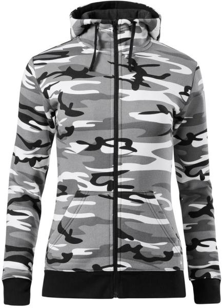 Trendi kenguru zsebes női terepmintás pulóver, kapucnival és cipzárral. A szabása kissé testhezálló, hogy kiemelje a nők sziluettjét. Teljes hosszúságában cipzárral záródik. A bélelt kapucni húzózsinórral összehúzható. Oldalvarratokkal és a nyakpánt belső részén szalaggal védve. Kenguru stílusú zsebbel van ellátva. A pulóver belseje kellemes meleget biztosít. Az alsó szegély és a mandzsetták bordázott anyagból készülnek, 5% elasztán hozzáadásával.