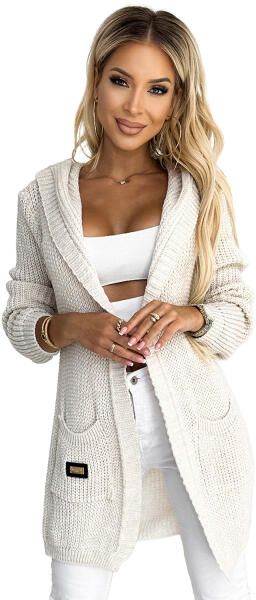 Női kardigán kapucnival, zsebekkel és folttal. Erősebb anyagból készült pulóver bézs színben. A méreteket laposan mérjük - az anyag nyújtása nélkül (+/- 2 cm) - megszorozzuk x2-vel. A képen látható modell 165 cm magas és UNI (XS - 2XL) méretet visel.
